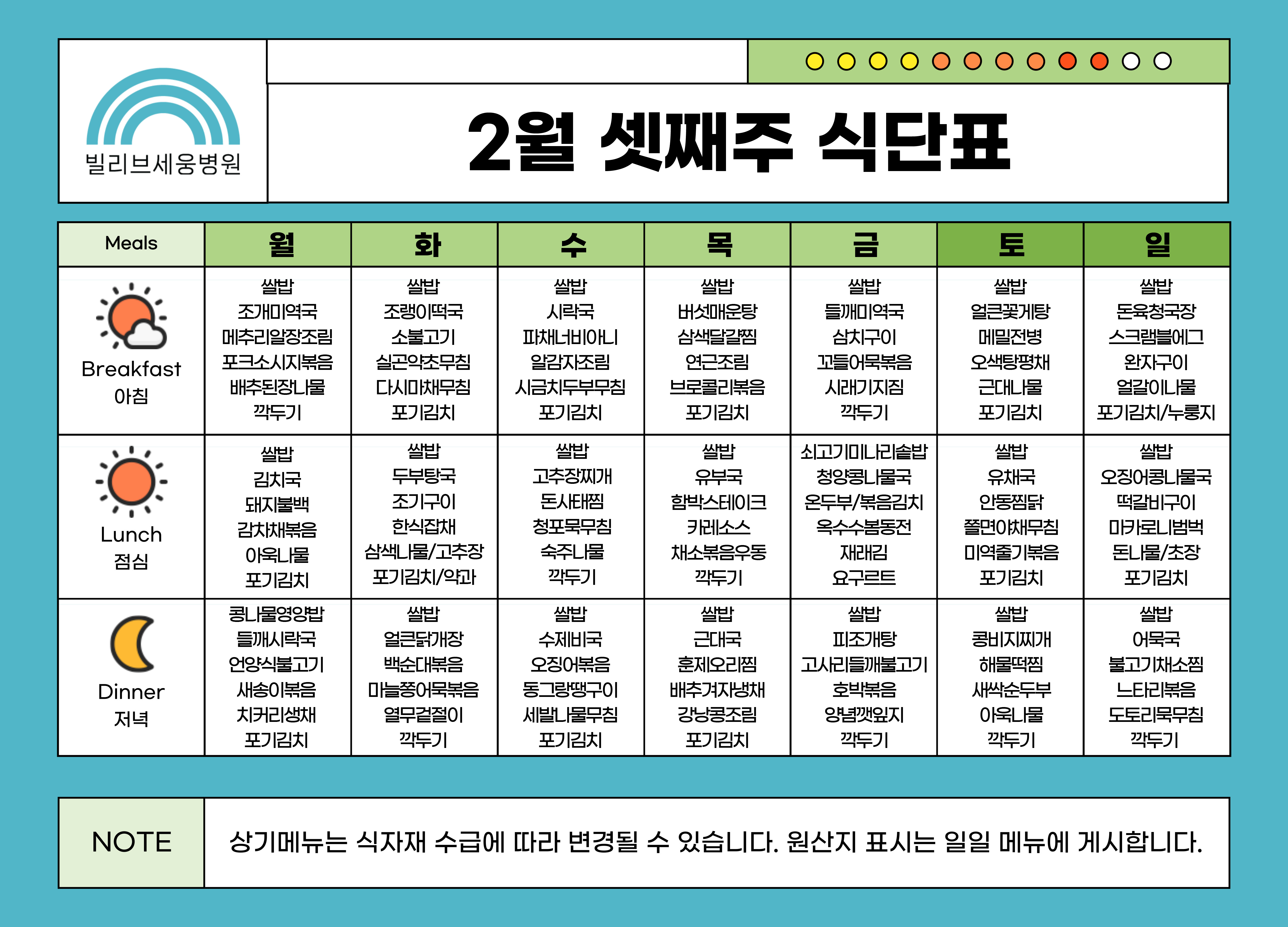 2월 셋째 주 식단표 업로드 안내 - 02/16(월) ~ 02/22(일)