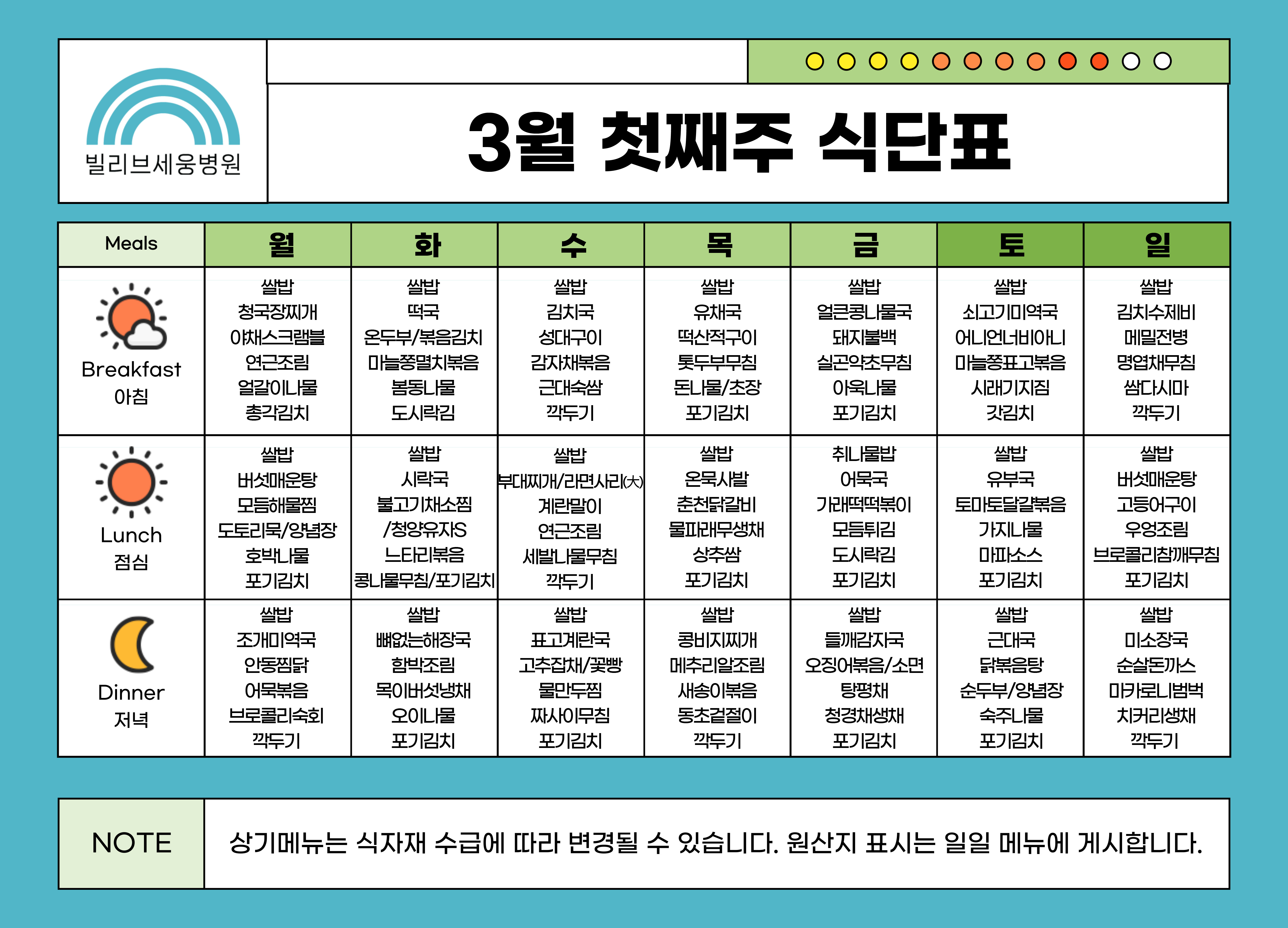 3월 첫째 주 식단표 업로드 안내 - 03/02(월) ~ 03/08(일)