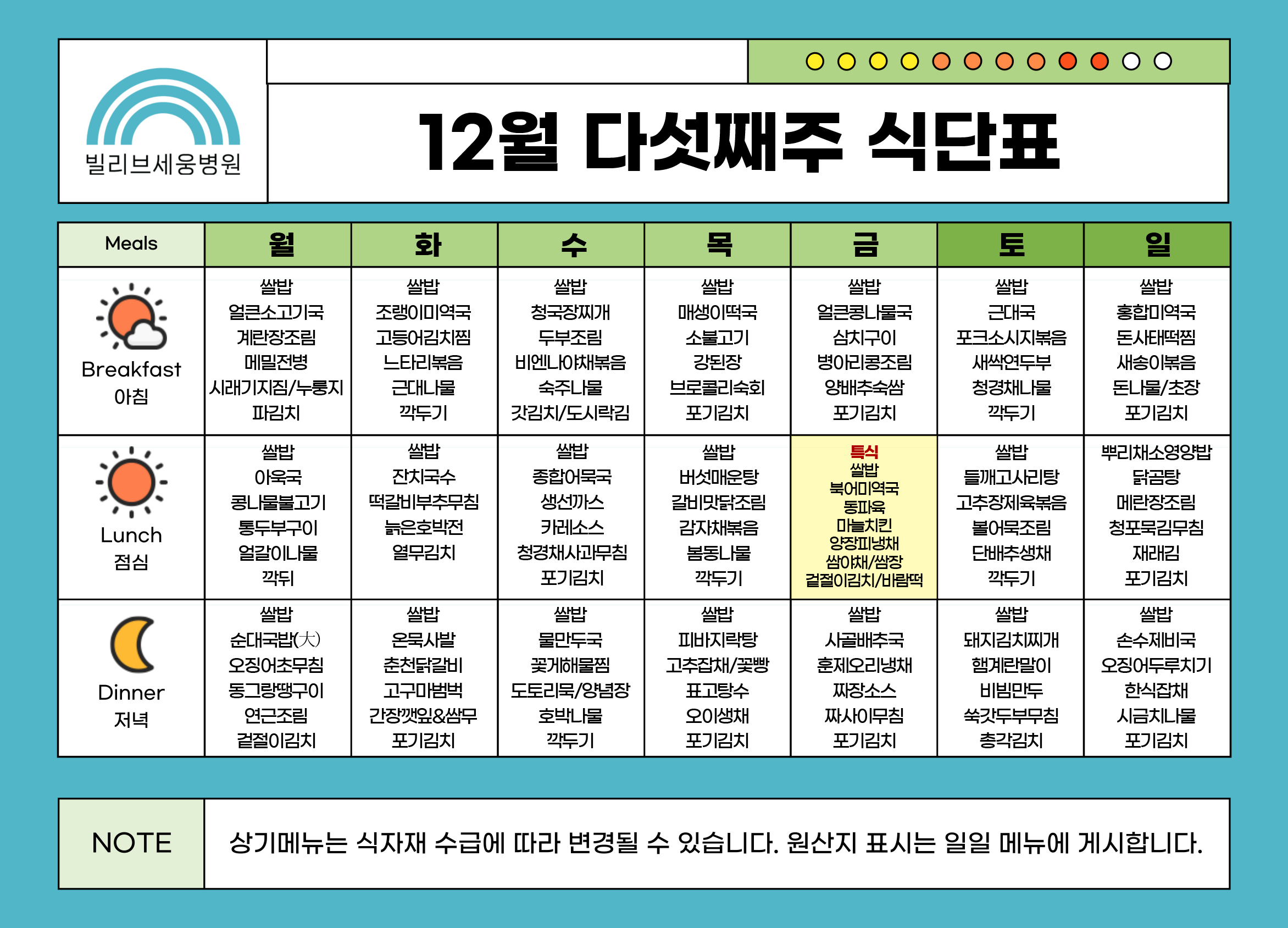 12월 다섯째 주 식단표 업로드 안내 - 12/29(월) ~ 01/04(일)