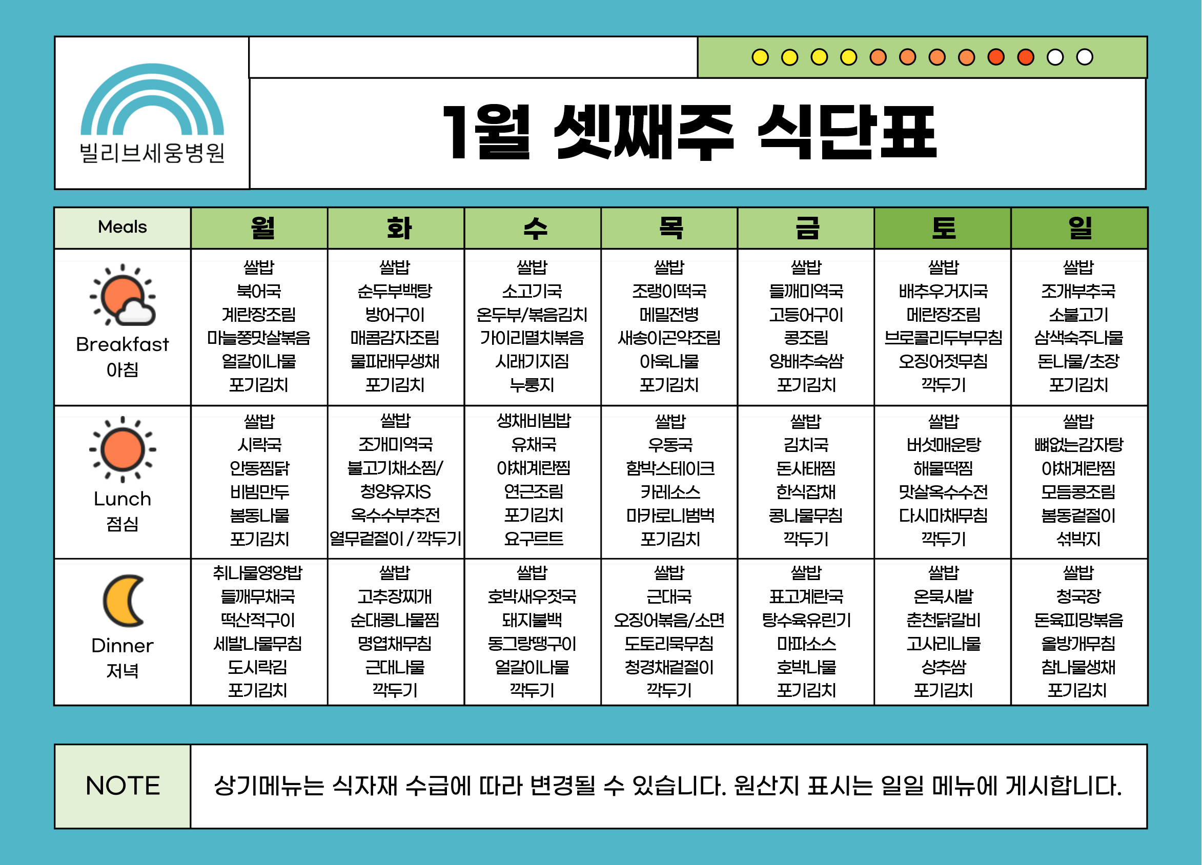 1월 셋째 주 식단표 업로드 안내 - 1/19(월) ~ 1/25(일)