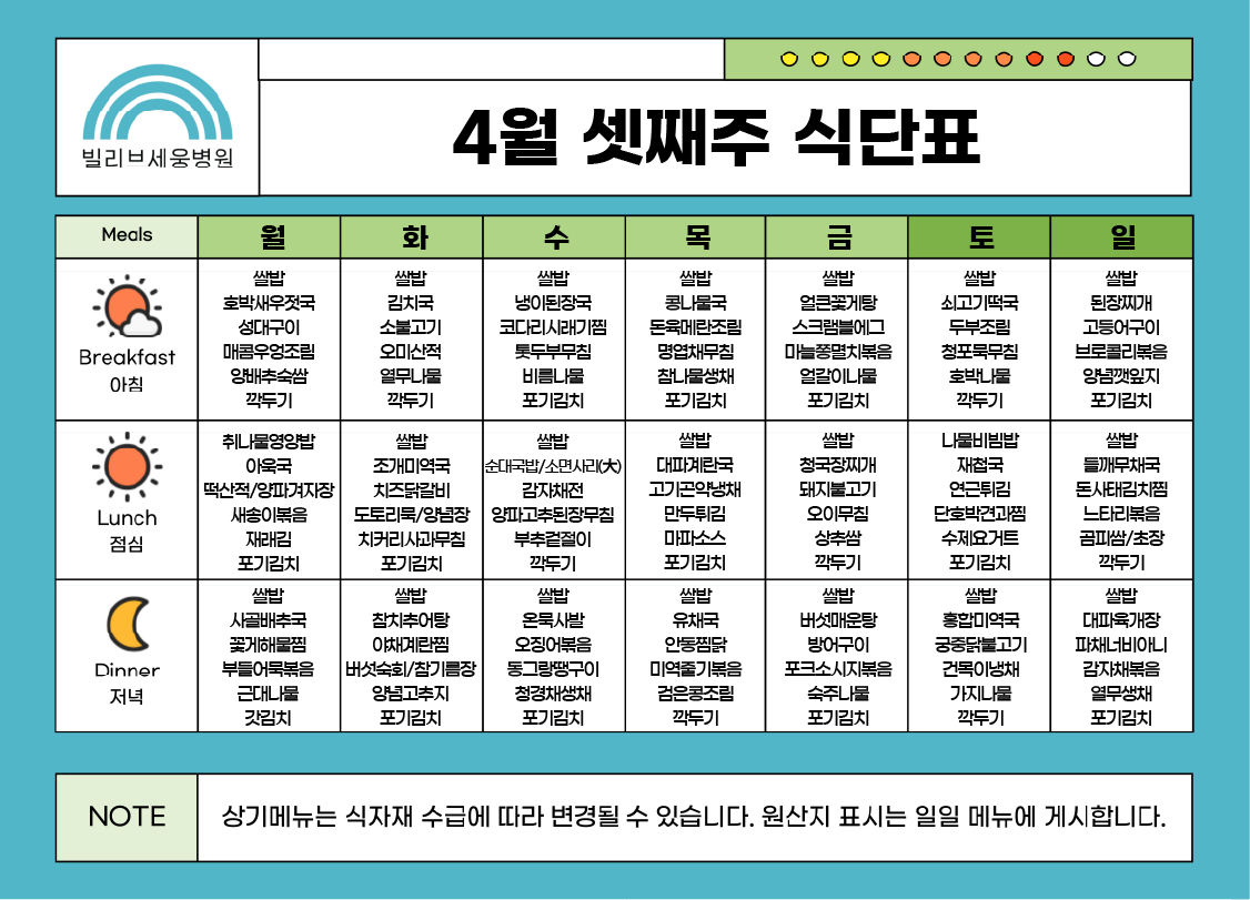 4월 셋째 주 식단표 업로드 안내 - 04/13(월) ~ 04/19(일)
