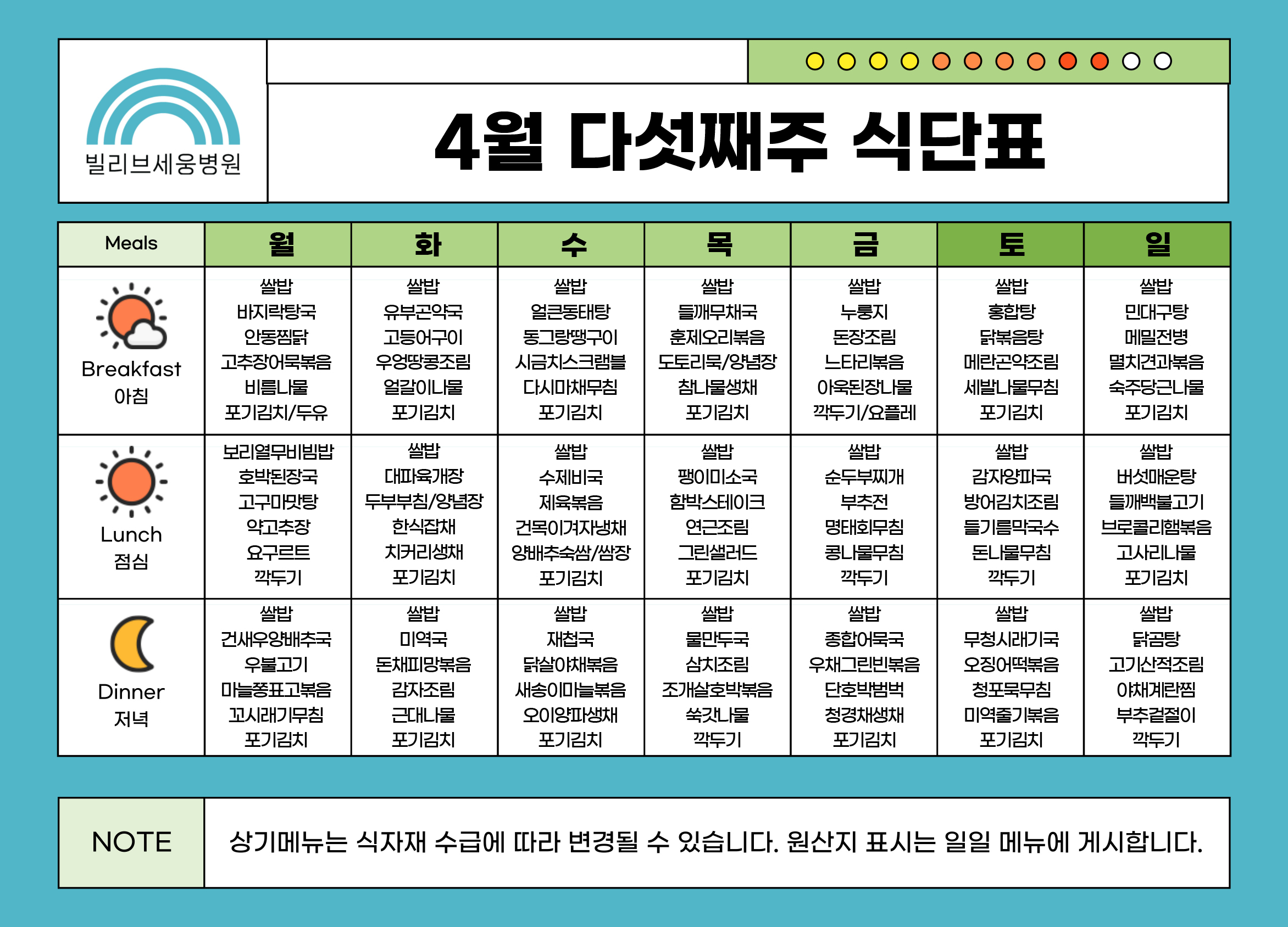 4월 다섯째 주 식단표 업로드 안내 - 04/28(월) ~ 05/04(일)