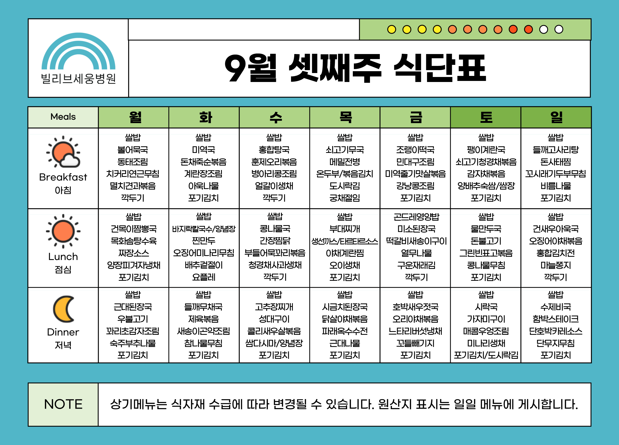 9월 셋째 주 식단표 업로드 안내 - 09/15(월) ~ 09/21(일)