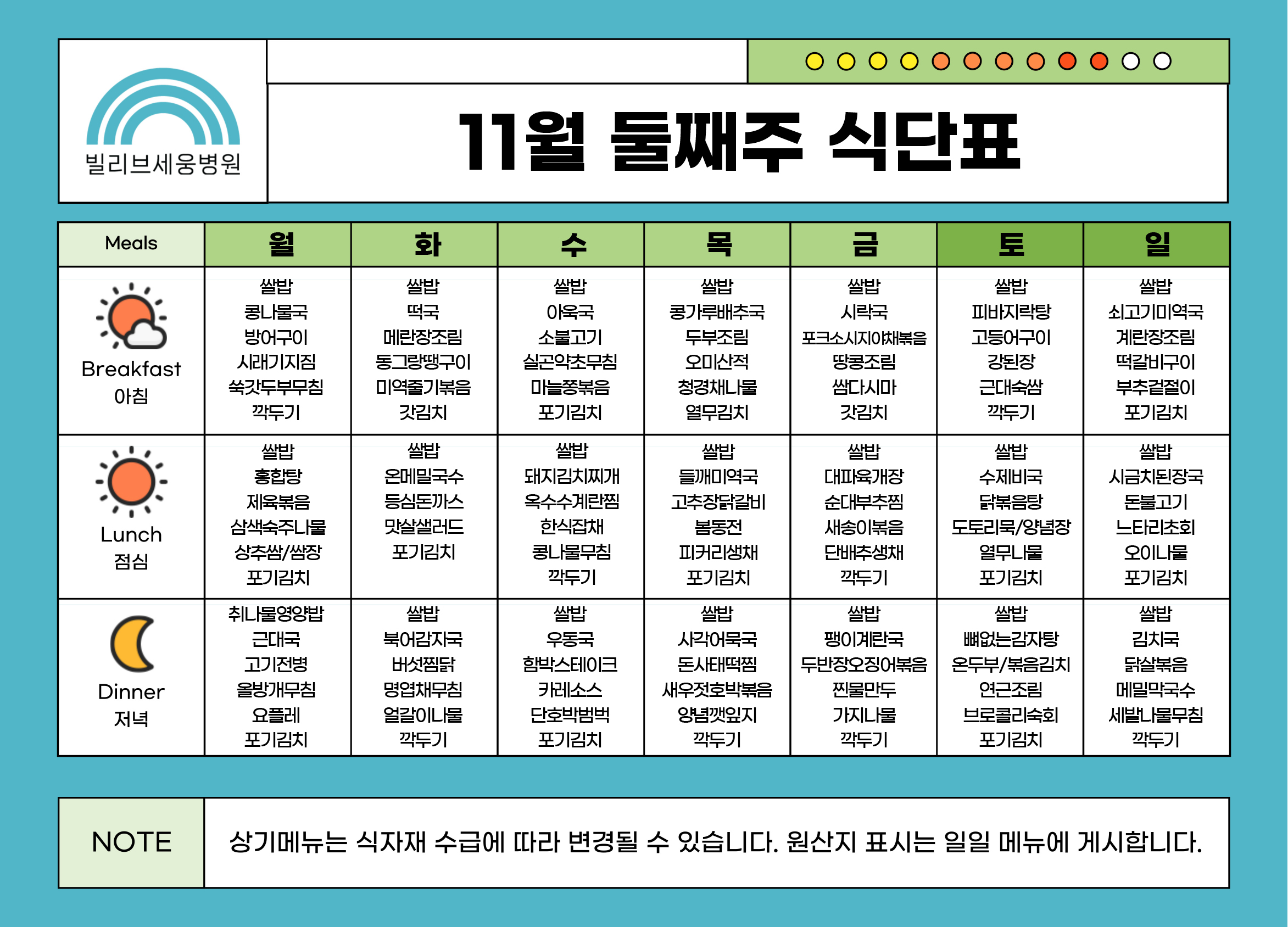 11월 둘째 주 식단표 업로드 안내 - 11/10(월) ~ 11/16(일)