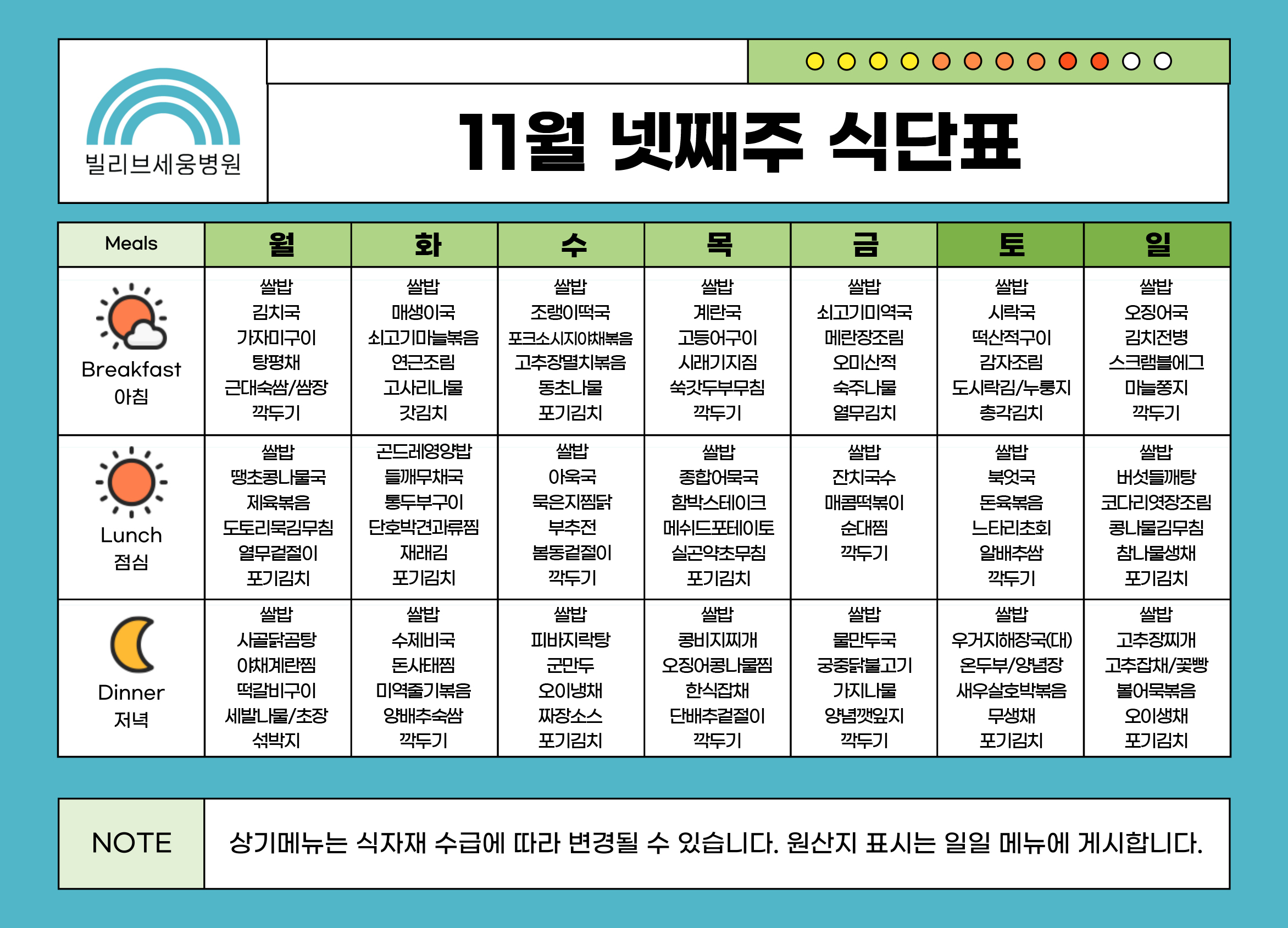 11월 넷째 주 식단표 업로드 안내 - 11/24(월) ~ 11/30(일)