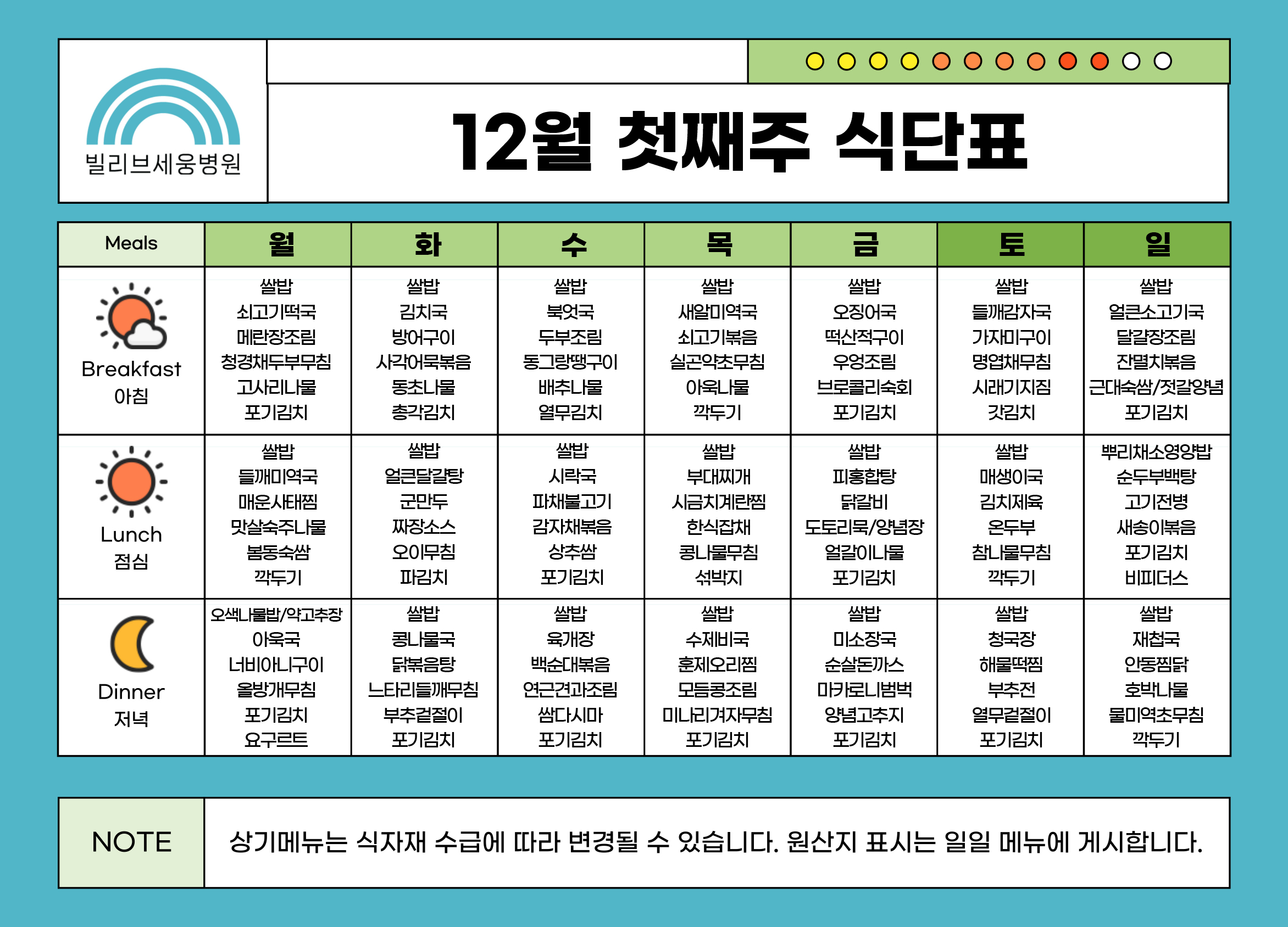 12월 첫째 주 식단표 업로드 안내 - 12/01(월) ~ 12/07(일)