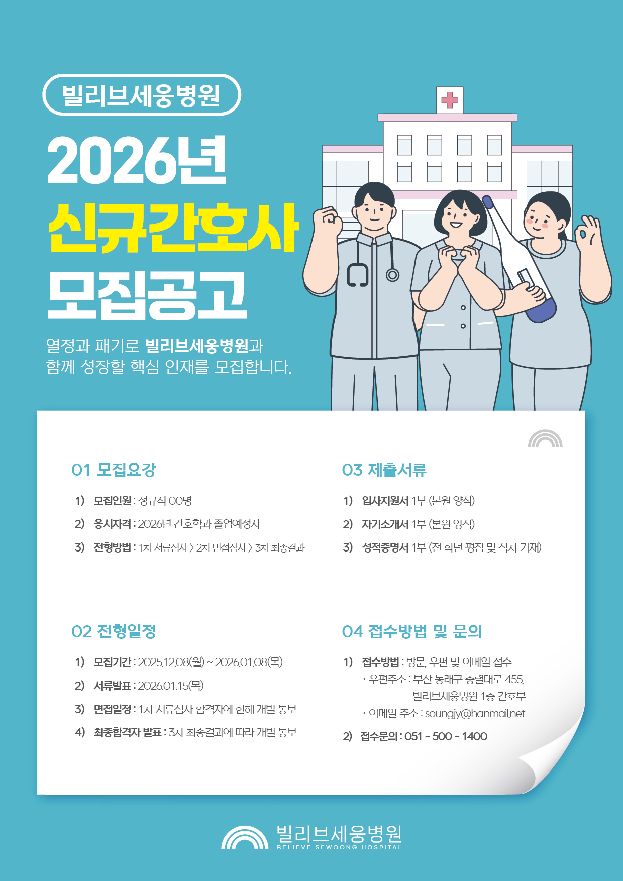 * 열정과 패기로 빌리브세웅병원과 함께 성장할 핵심 인재를 모집합니다.