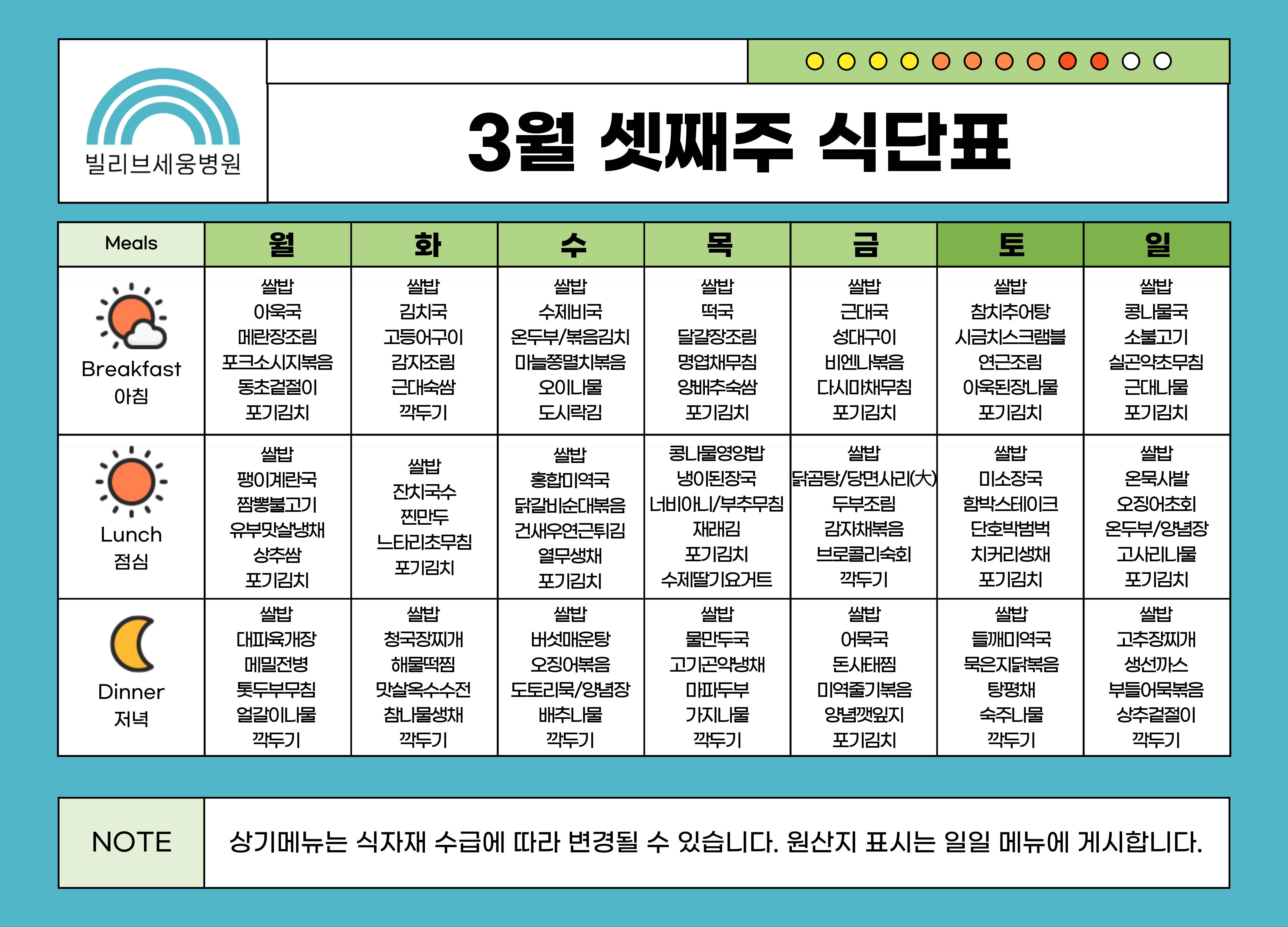 3월 셋째 주 식단표 업로드 안내 - 03/16(월) ~ 03/22(일)