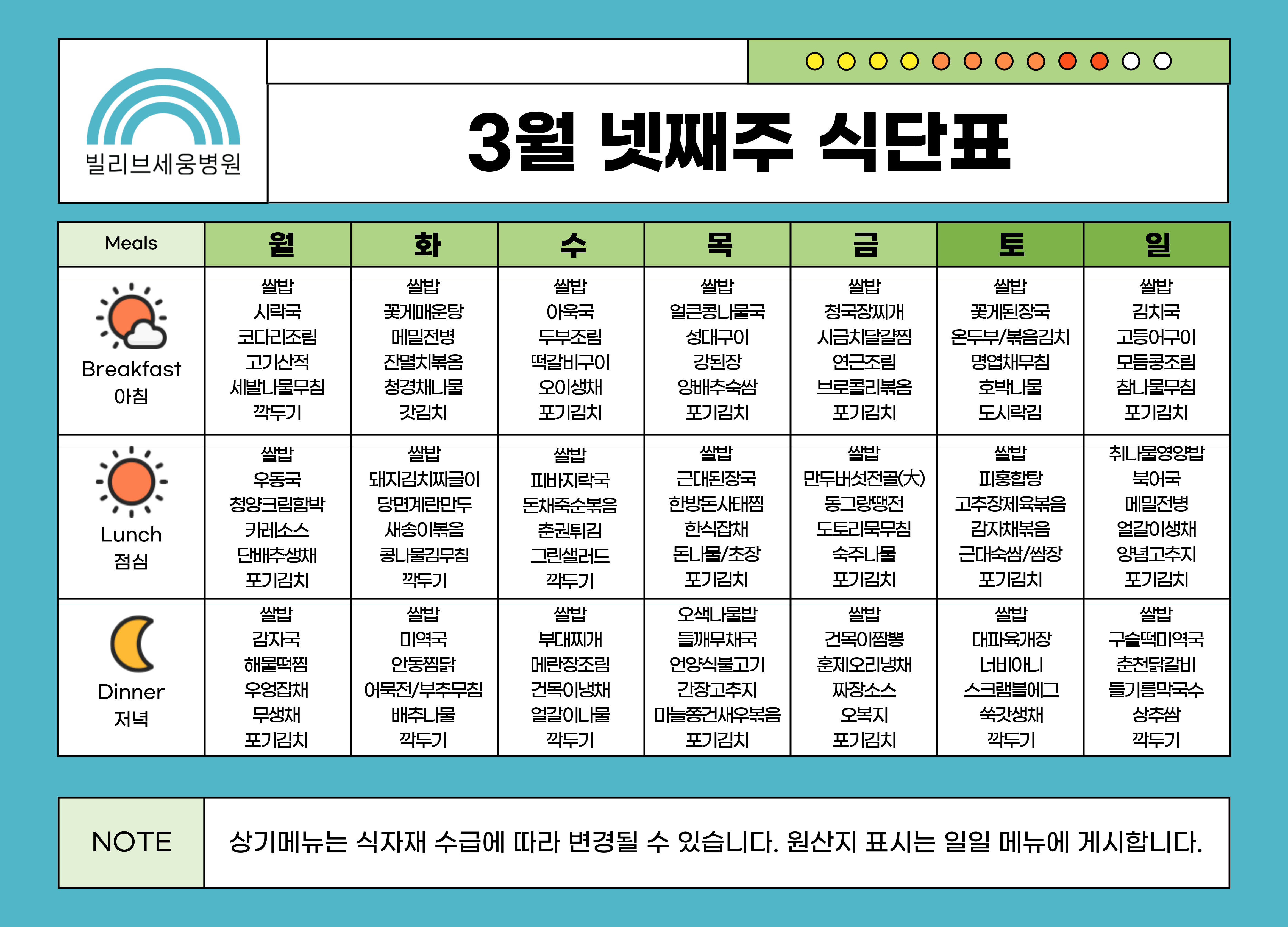 3월 넷째 주 식단표 업로드 안내 - 03/23(월) ~ 03/29(일)