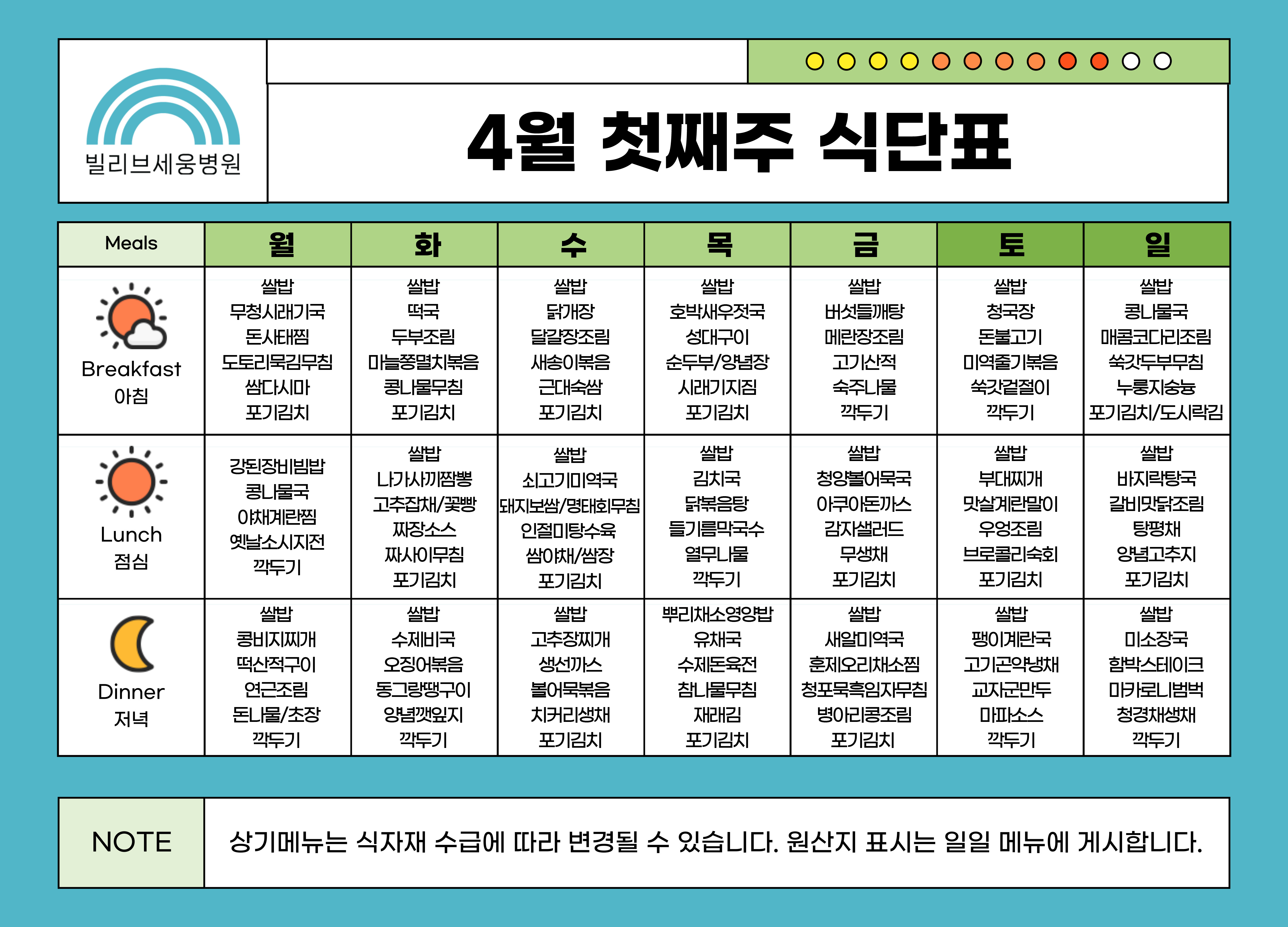 4월 첫째 주 식단표 업로드 안내 - 03/30(월) ~ 04/05(일)